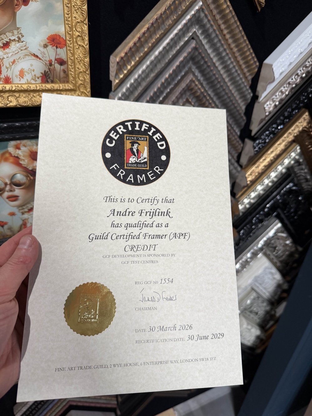 Op 30 maart 2026 heeft Onder de Molen met succes het GCF-examen van het internationaal gerenommeerde Fine Art Trade Guild afgerond. Daarmee mag Onder de Molen zich officieel Guild Certified Framer noemen – een erkenning voor vakmanschap, kennis en kwaliteit binnen het lijstenmakersambacht.